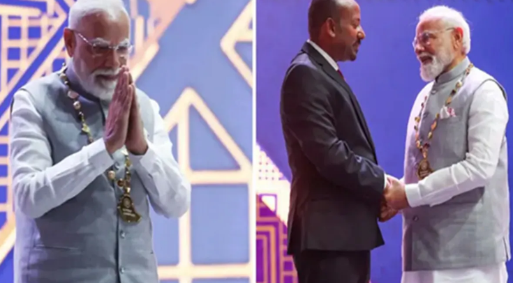 प्रधानमंत्री नरेन्द्र मोदी को मंगलवार को इथियोपिया के प्रधानमंत्री अबी अहमद अली ने अपने देश के सर्वोच्च नागरिक सम्मान ‘द ग्रेट ऑनर निशान ऑफ इथियोपिया’ से सम्मानित किया। यह पुरस्कार अदीस अबाबा में अंतरराष्ट्रीय सम्मलन केंद्र में आयोजित एक विशेष समारोह में प्रधानमंत्री मोदी को प्रदान किया गया।